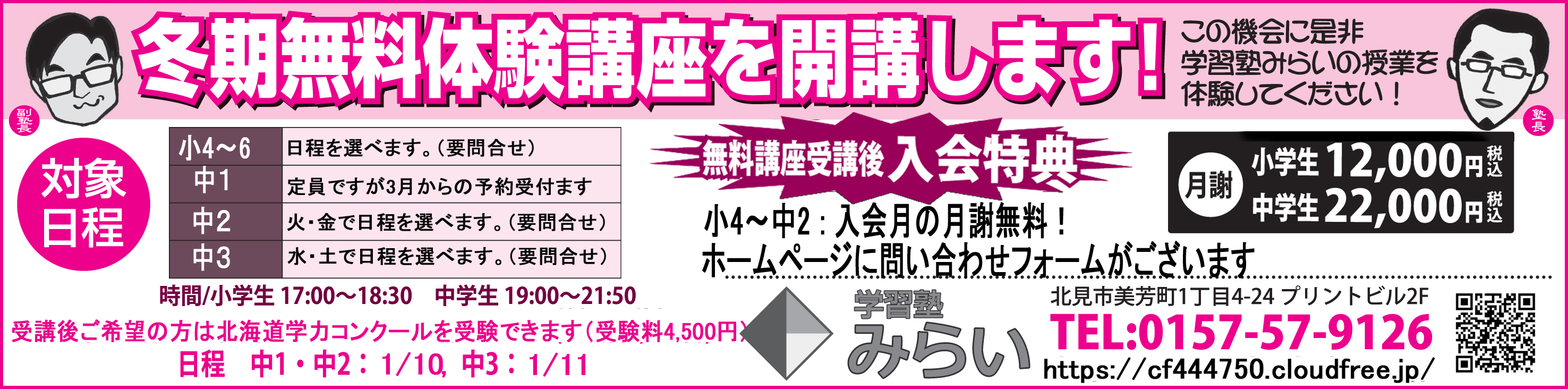 現在、新中1と中2が定員間近です。お早めにお申し込みください。